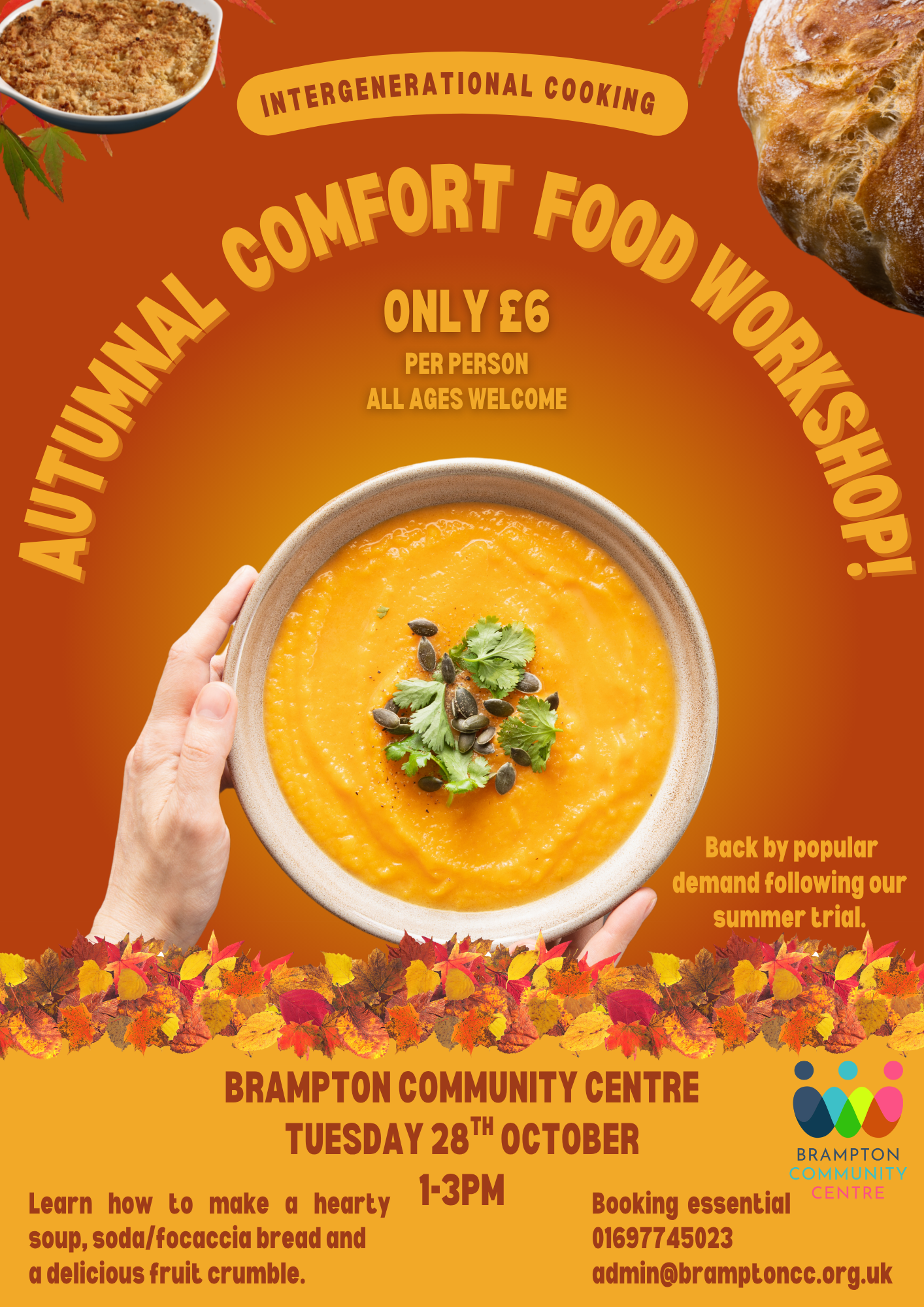 Join us for a seasonal intergenerational cooking workshop, back by popular demand after our successful summer session. Learn how to make a hearty soup, soda or focaccia bread, and a delicious fruit crumble using simple, wholesome ingredients.
