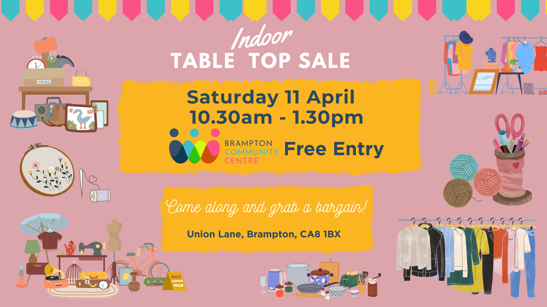 Sellers £5 per table pre-booked in advance as spaces are limited. To book email admin@bramptoncommunitycc.org.uk or phone 016977 45023.