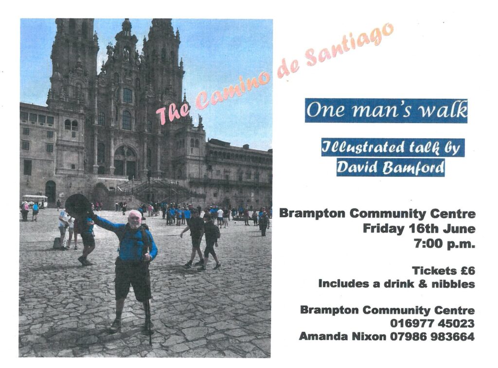 Friday 16th June – 7.00pm at Brampton Community Centre. Tickets £6 which includes a drink & nibbles. This illustrated talk hosted by David Bamford will cover his extensive pilgrimage walk…