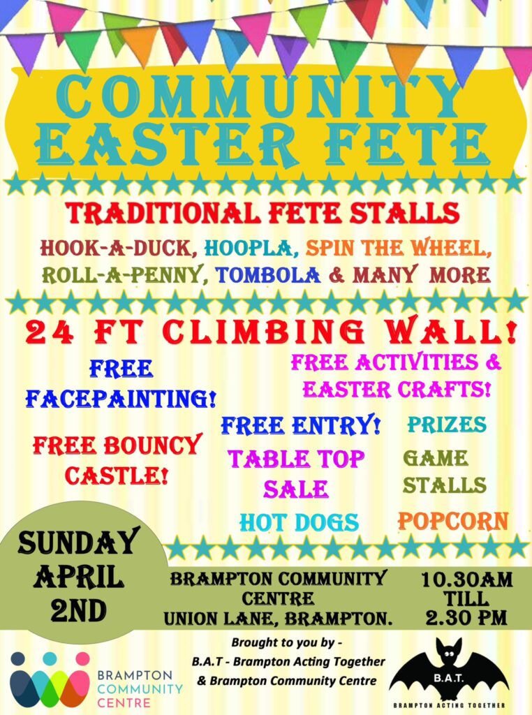 After the success of last year, we are happy to announce that once again we will be working with Brampton Acting Together (B.A.T.) to bring the Community Easter Fete back…