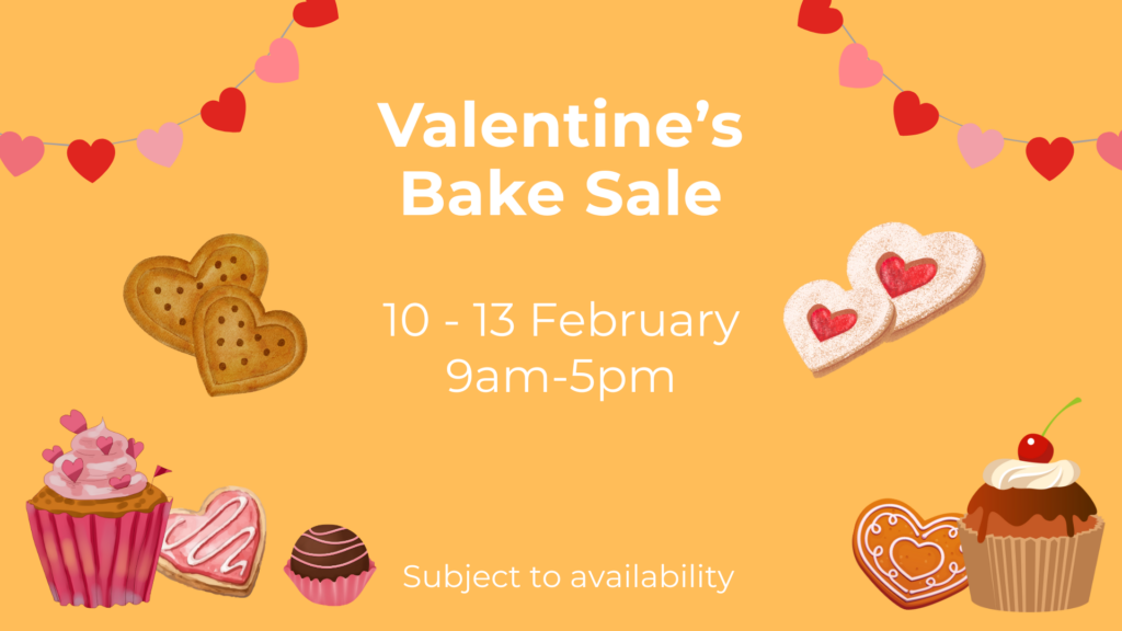 Valentine’s Bake Sale 10am – 5pm Share the love with a delicious selection of home bakes treats. Available daily to takeaway from the Foyer at the Centre Subject to availability.