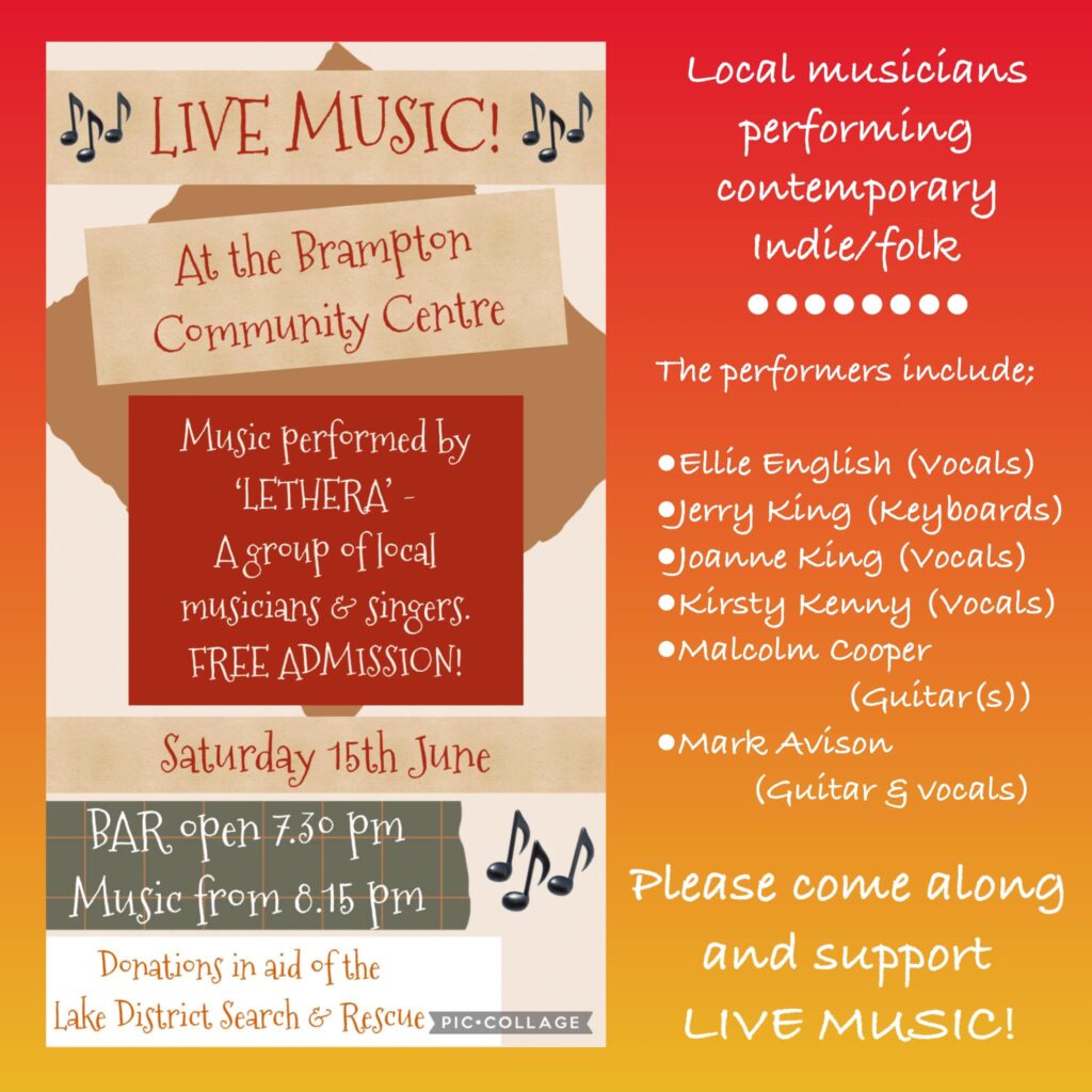 A night of live music at Brampton Community Centre Music performed by ‘Lethera’ – a group of local musicians and singers. FREE ADMISSION: Donations in aid of Lake District Search…